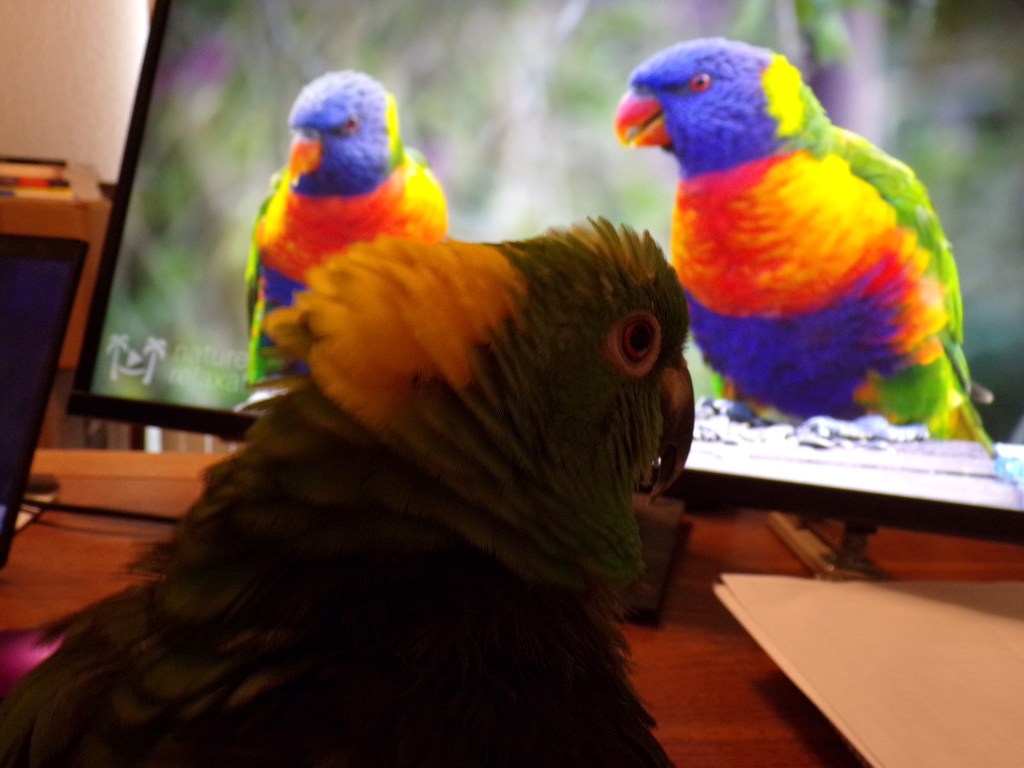 We have two parrots, Jess and Aldo, who’ve been with us going on 40 years now. Jess is very good at mimicking sounds, and he coughs exactly as we do when we’re sick. Our Yellow-naped Amazon thinks it’s funny.