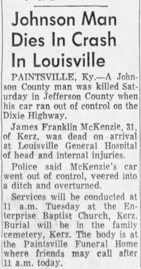 Sadly, 15 years after the first crash, on February 24, 1973, James Franklin McKenzie, the son of a coal miner, was behind the wheel of a vehicle in Louisville, Kentucky, when it veered off Dixie Highway and overturned. James F. McKenzie, age 31, was killed on impact.