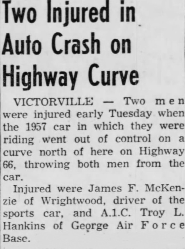 On July 9, 1957, my father was riding ‘shotgun’ in a 1956 Chevrolet Corvette, on Route 66 in Victorville, California. The car owner, James F. McKenzie, was showing Dad how his new sports car handled. Before I go further, I’ve been asked numerous times if this vehicle was “fuel-injected.” Vintage photos show it was not.