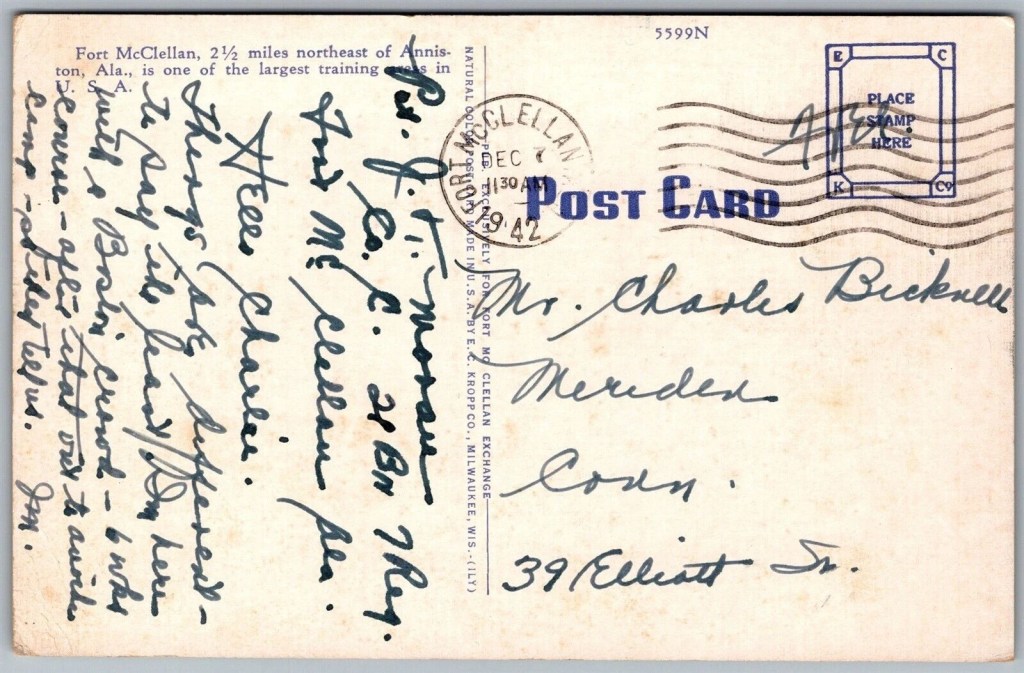 On December 7, 1942, Pfc. James T. Moran sent a picture postcard purchased from the Past Exchange at Fort McClellan to a former teacher, Mr. Charles Bicknell at 39 Elliott Street in Meriden, Connecticut. This was exactly one year after Pearl Harbor was bombed. On front of the postcard is a photo of soldiers undergoing weapons training.