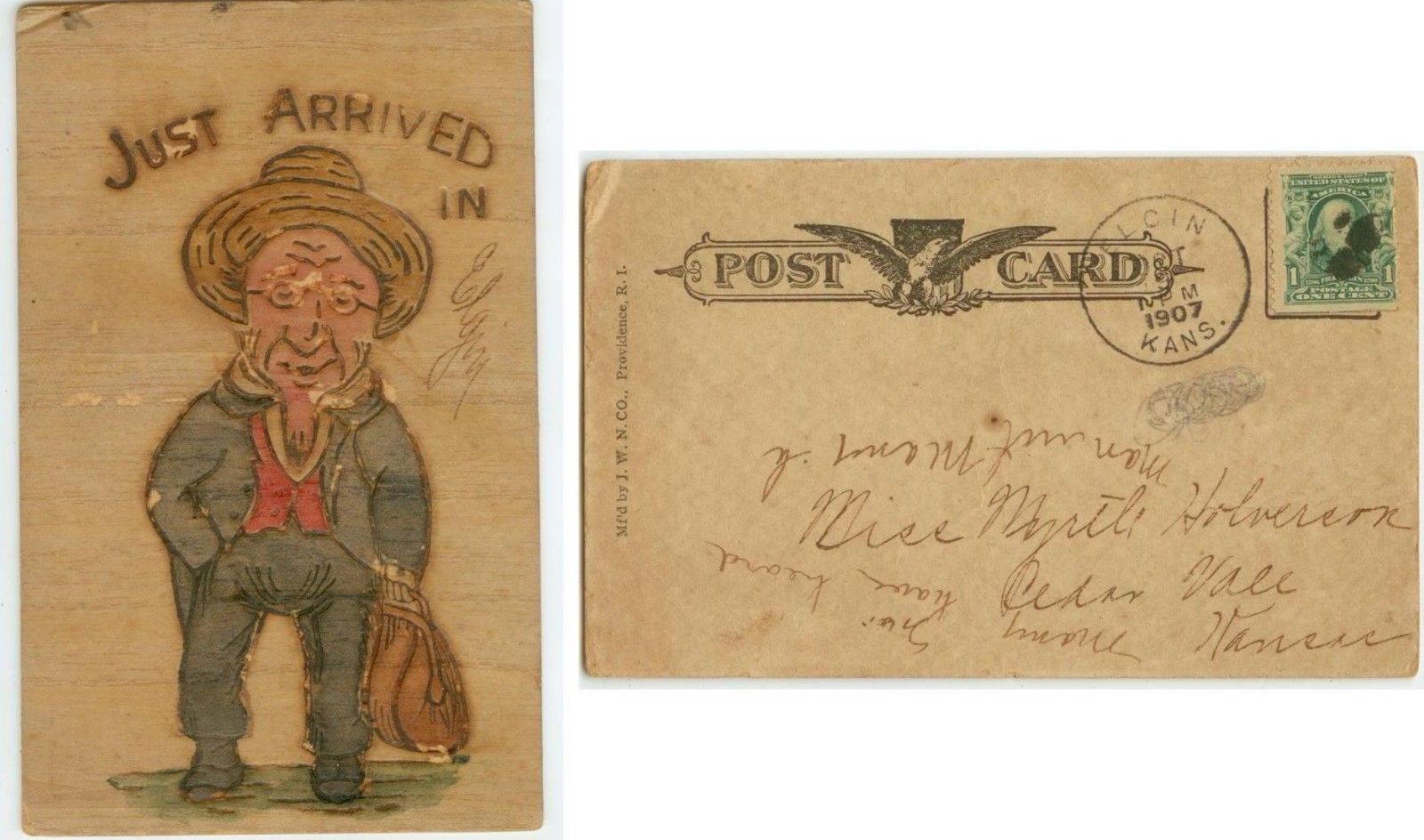 The picture on front features a comical looking fellow. He’s an older gentleman sporting a straw hat, goatee, and purse. The card reads: JUST ARRIVED IN ______. The purchaser of this card had to fill in the blank. In this case it reads “ELGIN”.