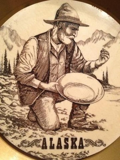 On our office wall hangs a marble plaque. Bill Devine’s signature is etched on bottom along with the date 1982. Artwork portrays realistic portrait of a bearded miner bent over a stream. The grizzled character is holding a gold pan and nugget. Very few people know this: Bill penned that scene in his own image. My neighbor claimed had he not been an artist, he would’ve become a gold miner.