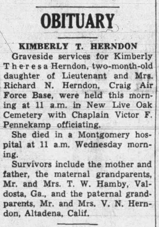I didn’t find out until much later that Richard Herndon and his wife lost a newly born daughter on January 28, 1959. The little girl, Kimberly Therese Herndon, was only two months old. She’s buried at New Live Oak Cemetery in Selma. Mary Herndon lost a husband and child in eight months.