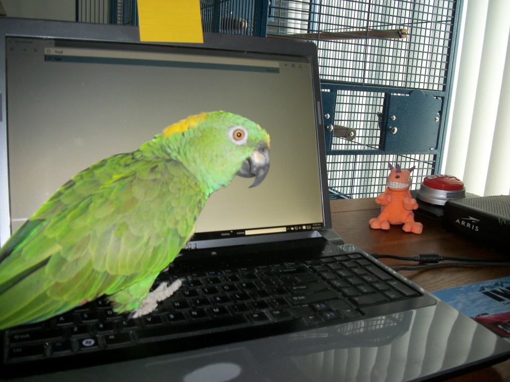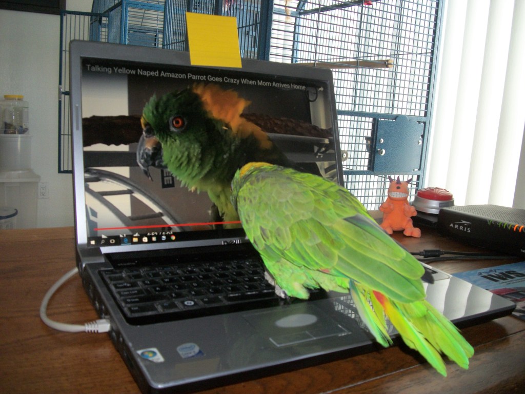 Jess is strictly my pet. He’s a Yellow Nape Amazon also of medium size. I came by Jess after my pal could no longer keep the guy. Jeff’s wife developed bad asthma being exposed to his parrot dander. Some folks are that way.