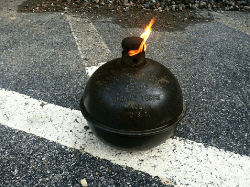 Back then there wasn’t battery-powered warning lights on the edge of the highway advising folks to slow down. Construction crews used black “smudge pots” as dad called them to alert drivers. These pots were round in shape and contained kerosene and cotton wicks much like lanterns and lamps. To me they resembled bombs.