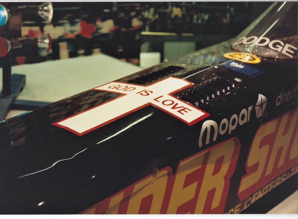 “The dragster carries a Christian cross and the words “God is Love.” This reflects Garlits’ experience in 1959 when, after an accident, his system could not handle pain-killing drugs. In severe pain, he cried out, “Lord help me,” and his pain ceased.”