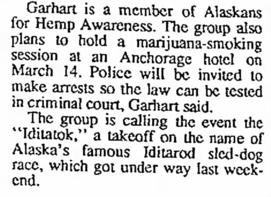 It was 1991, when a group of marijuana connoisseurs came up with a companion event to the Iditarod Sled Dog Race. They named their bizarro gettogether, “IDITATOK.” Marcus mentioned it on his show, saying that the idea was hilarious.