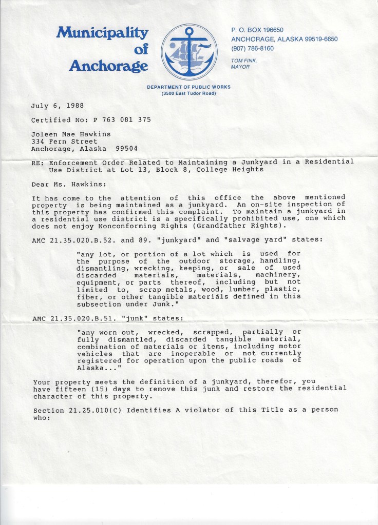 The day I came home from work and my wife handed me a certified letter from the Municipality of Anchorage, stating that she was operating a junkyard will never be forgotten. The expression on her face is priceless.