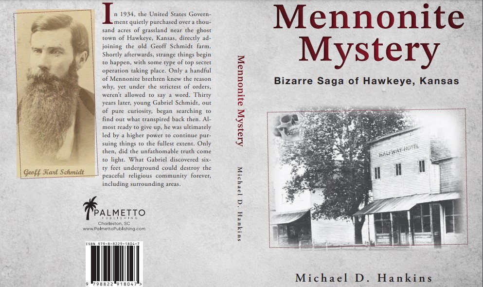My latest book, “MENNONITE MYSTERY – Bizarre Saga of Hawkeye, Kansas” will be out early spring, 2024. The manuscript is complete and in the edit stages. Final book covers (front and rear) are being put together at this time.