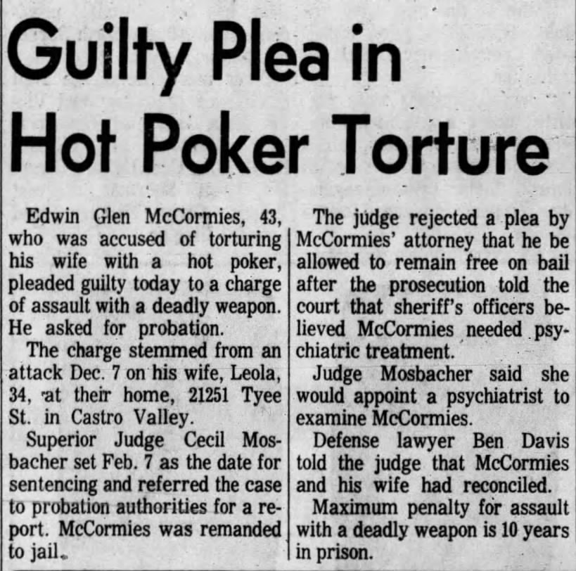 In my research, I uncovered a disturbing story about McCormies that I won’t discuss. For those wanting to know more, this public information is available by searching an “Oakland Tribune” newspaper dated June 17, 1964 – page 21.