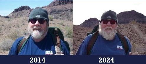 I still owned the original North Face backpack, the same hat, sunglasses, shirt, and Ocotillo walking stick used in the 2014 picture. The toughest part was for me to line up in the same position, with a specific mountain on each side of my head.