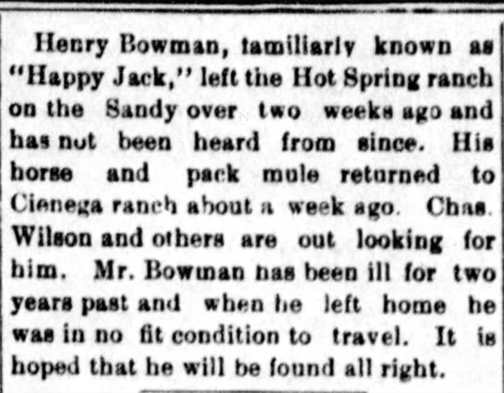 I presented that question to a Yucca forum site and ended up with several valid answers. One individual thought that Happy Jack was a train engineer, with two others saying that he was a former rancher in the area who owned a large section of land. A forum member said that she had an old newspaper article dictating such. It took some digging, but I eventually found several articles. Thanks to Deana, Karon, Renee, and Starr for helping me with this project.