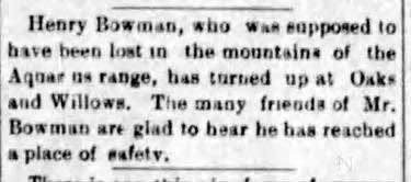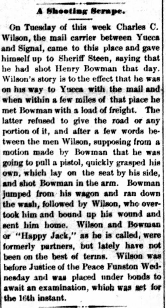 Newspapers paint a vivid photo of Henry Bowman. He had a partner in this stage and freight operation, Charles Wilson, but the two men eventually had a falling out and went in separate directions. Meeting on a trail one spring day near Yucca in their wagons—neither gave way to the other.