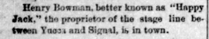 Henry Jack Bowman is the real name of “Happy Jack.” Moving to Yucca from Tombstone in 1881, he came to the area at the same time the railroad was being constructed.