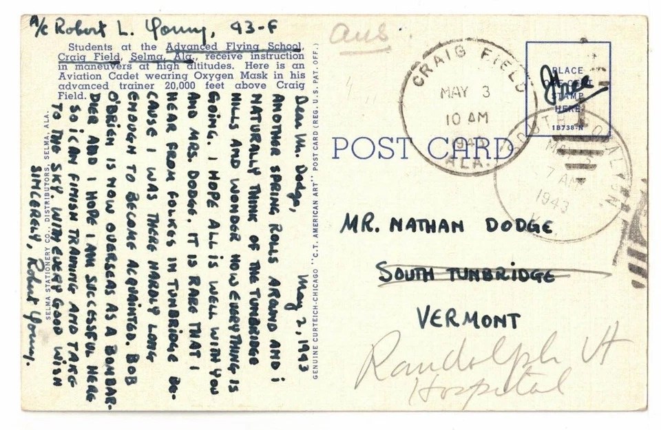 The postcard is postmarked “Craig Field, May 3, 1943.” This was a Monday, and World War II was still raging. Air Cadet (A/C) Robert Young mailed the card to someone named Nathan Dodge in South Tunbridge, Vermont. The postcard was then forwarded to the Randolph, Vermont, Hospital.