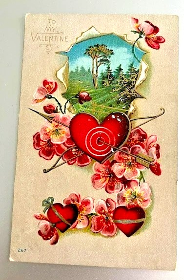 This colorful Valentine’s Day card with a nice message features Cupid with his bow, along with what appear to be Magnolia flowers, and a nature scene that I believe to be a growing field of flowers. “To My Valentine” appears on top.