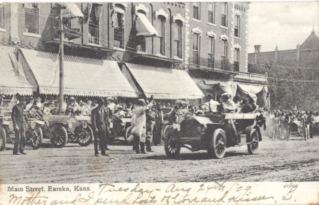 The photo on front of the postcard shows Eureka, Kansas, with some type of celebration going on. Written on the bottom of it is an additional message to R.C. from Linetta, showing how close this family was!