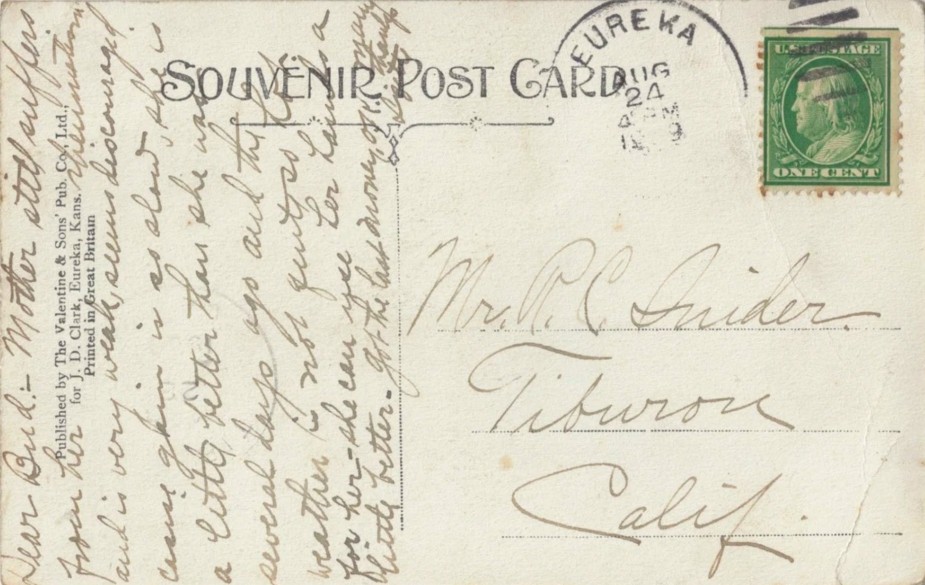 The Sniders were among the earliest settlers of Kansas, traveling there by covered wagon in 1857. An old Eureka postcard I came across mentions members of one of those early Snider families. This 1909 postmarked card was sent to Mr. R.C. Snider in Tiburon, California.  The transcribed letter is as follows:
