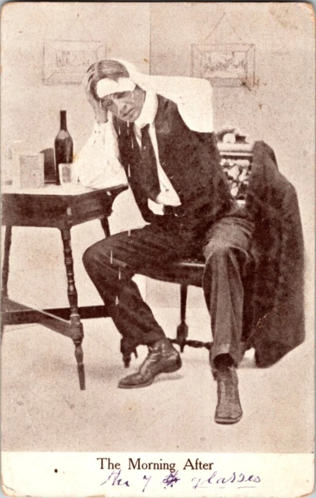 The front of the postcard shows a man sitting at a small table with a towel wrapped around his head. It appears he’s in great pain. A bottle of what appears to be wine is seen on the table along with a glass. Underneath the picture, printed by the postcard manufacturer, the following statement is written: The Morning After. Underneath that in smudged ink, most likely written by the sender, “Has 7 glasses.”