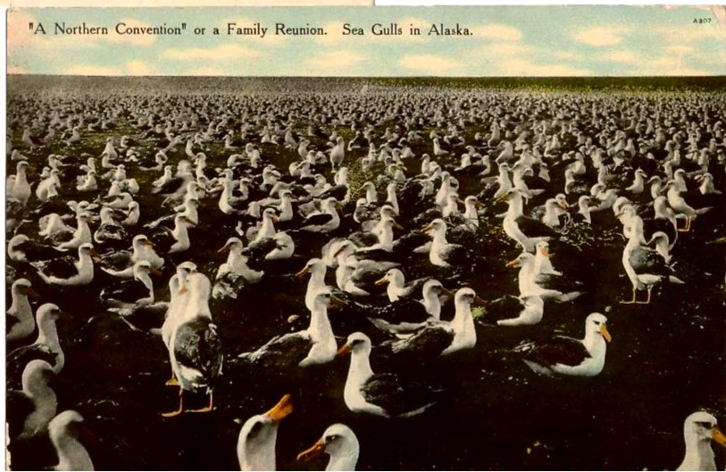 The card, postmarked in Saint Michael, Alaska, shows a flock of white seagulls on a beach with the caption: “A Northern Convention” or a Family Reunion. Sea Gulls in Alaska.
