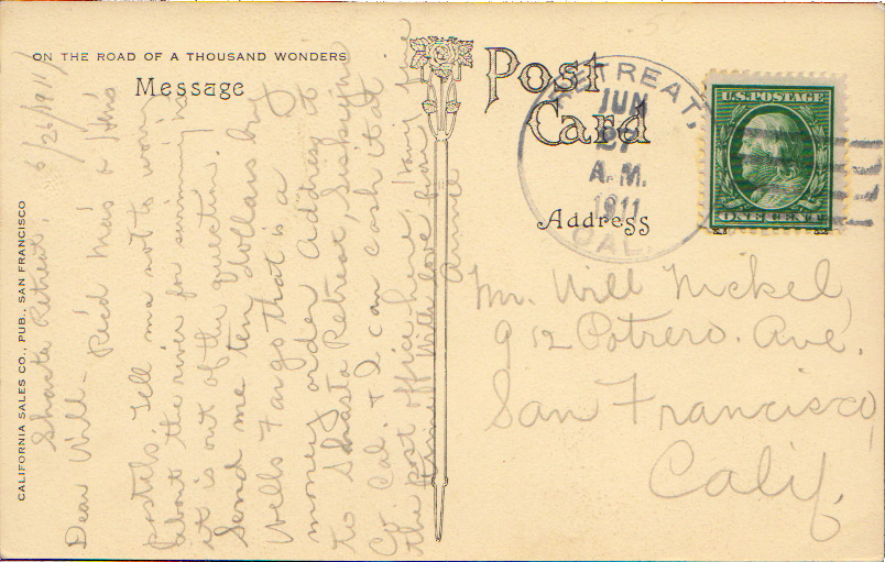 Re’cd Ma’s and Henry’s postels. Tell ma not to worry about the river for swimming, it’s out of the question. Send me ten dollars by Wells Fargo that is a money order. Address it to Shasta Retreat, Siskiyou Co. Cal. I can cash it at the post office here. Having fine time!