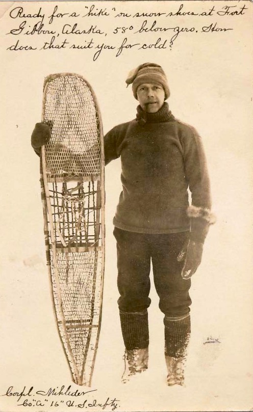 A postcard that I recently snagged was mailed from Tanana, Alaska, on February 10, 1911, to Mrs. J.T. Hoover in Pasco, Washington. On the front of the RPPC (real picture postcard) is a picture of US Army Corporal Gust Mihleder in full Arctic gear, standing beside a pair of tall snowshoes, while smoking a pipe.