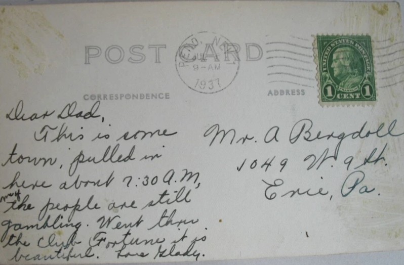 Gladys Bergdoll was born in 1909. She would’ve been 25 years old while visiting Club Fortune, and a single woman, undoubtedly kicking up her heels a bit, regardless that Gladys doesn’t mention such to dad. She married Clarence Martin on June 26, 1945, while Clarence had just returned from overseas duty during WWII.