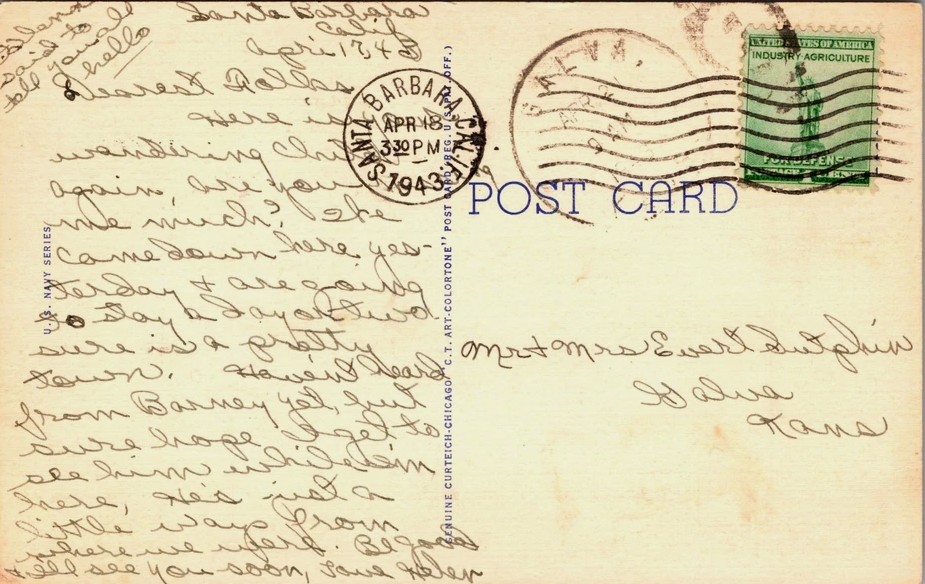 Someone named Helen mailed the colorful card from Santa Barbara, California, on April 18, 1943, to Mr. & Mrs. Evert Sutphin in Galva, Kansas. Helen’s letter on the back of the postcard is dated April 17.