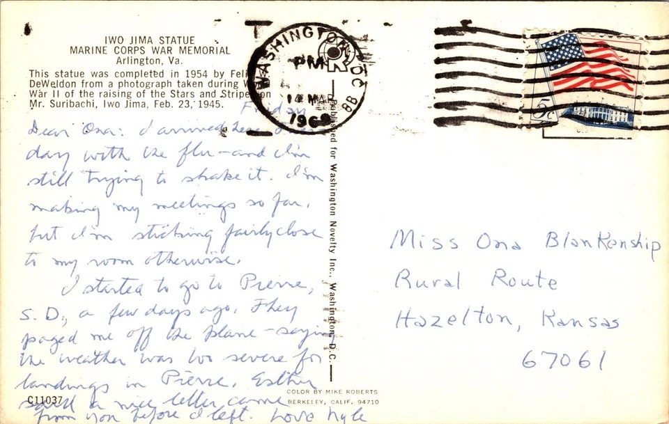 The recipient of this March 14, 1969, double-postmarked postcard, sent from Washington, D.C., was Miss Ona B.J. Blankenship in Hazelton, Kansas. The Hazelwood post office was still open at that time, and that’s where she picked it up. Ona was 82 at that point.