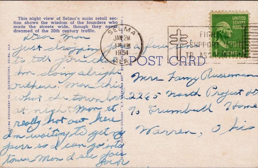 A picture postcard mailed on January 2, 1951, features Broad Street in Selma, Alabama, at night. 1940s vehicles can be seen parked, while one driver has their headlights on.
