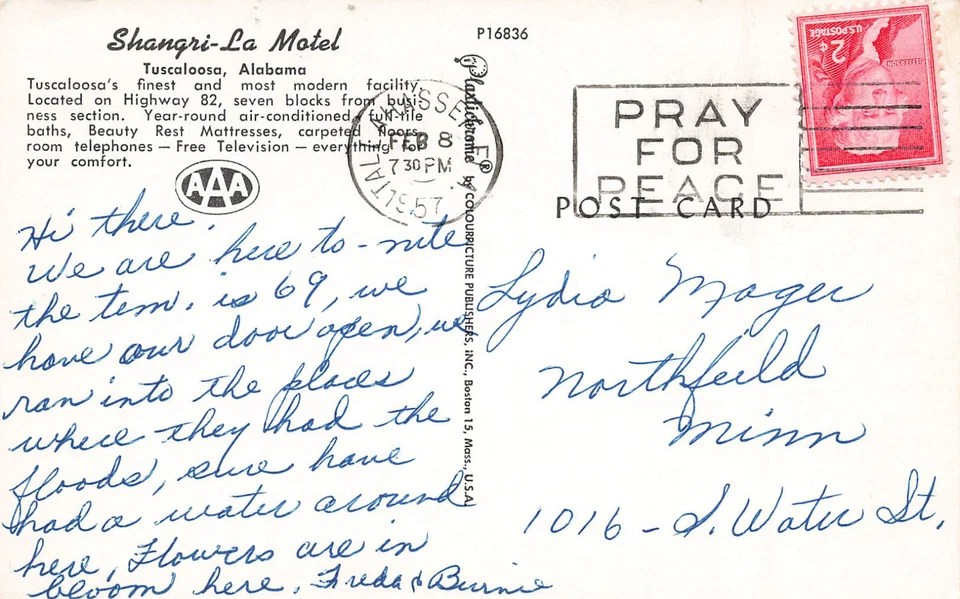 Someone named Freda & Burnie sent this postcard to Mrs. Lydia Mager in Northfield, Minnesota, on February 8, 1957. The traveling couple mailed it from a Tallahassee, Florida, post office. The free postcard would’ve been found in the motel room desk for Freda & Burnie’s use, along with a Gideon’s Bible. The message said:
