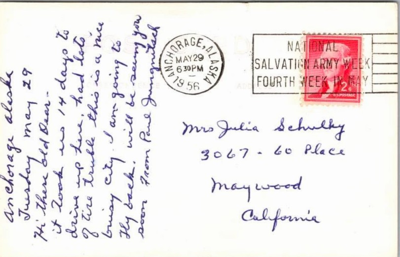 He makes no mention of visiting Mt. McKinley or Wonder Lake. I assume Mr. Jungnitsch picked this card up from one of the Anchorage gift shops. There’s more information regarding Julia Schulkey and Paul Jungnitsch at the end of this writing.
