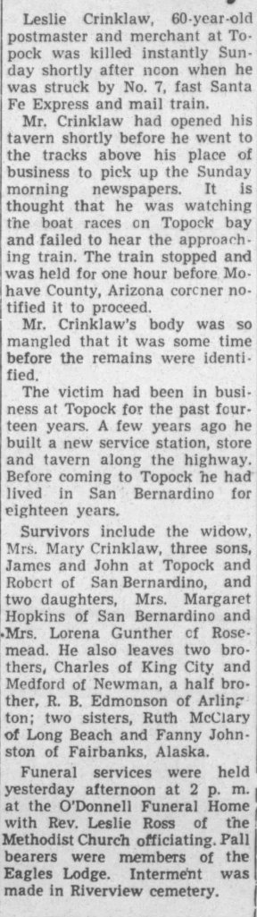 On a sad note, regarding Les Crinklaw, the businessman in Topock who operated the Chevron gas station mentioned earlier in the other postcard. Les was walking on the railroad tracks on October 15, 1950, when he apparently didn’t hear a train approaching. The Topock resident was struck and instantly killed.