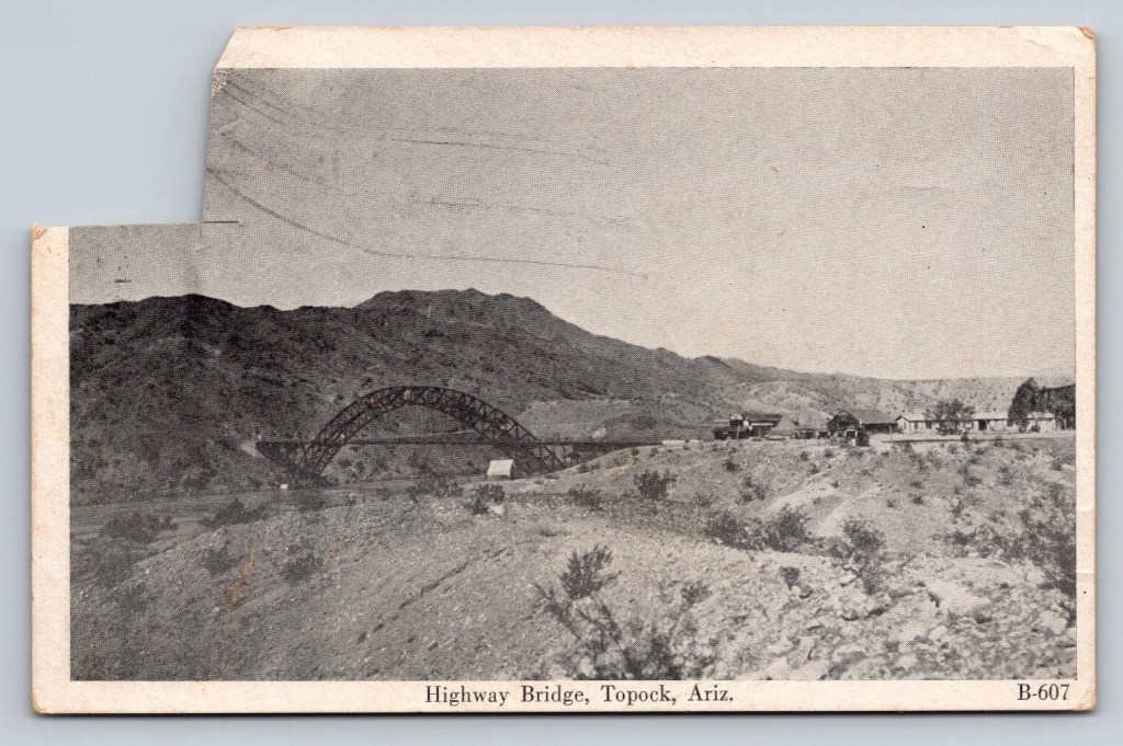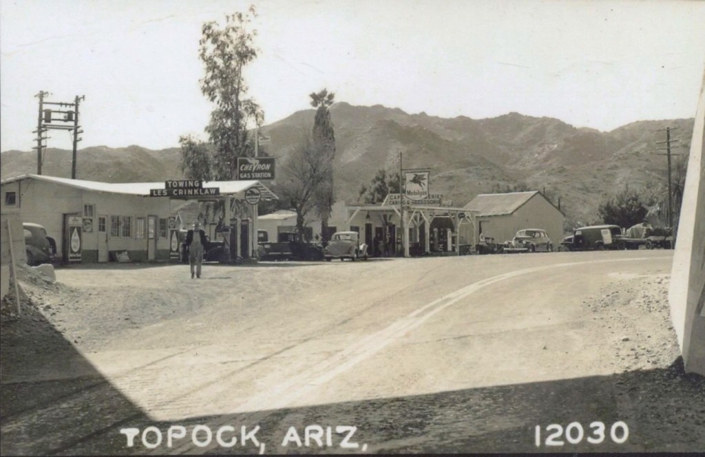 Recently, I came across a couple of old picture postcards, one of which highlighted the famous arched bridge and a small segment of the now-razed town of Topock. The other card has a good photograph of the community itself, with it never having been used, unlike the first. This unblemished card shows a Chevron gas station, towing service, and a cafe owned by Les Crinklaw.