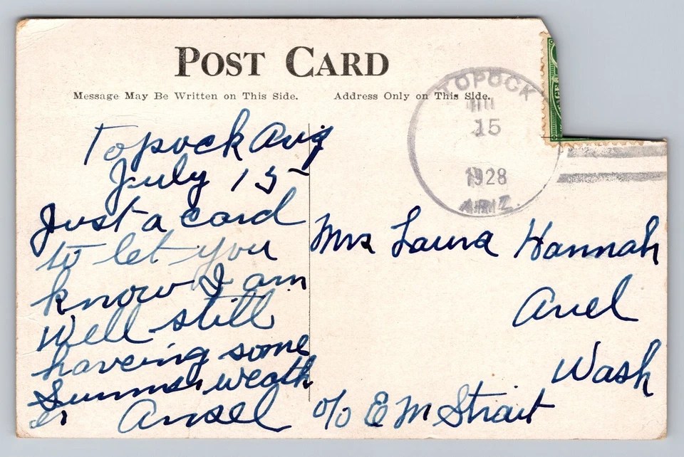 On July 15, 1928, someone named Ansel sent the now 97-year-old bridge postcard to Mrs. Laura Hannah in Ariel, Washington. The name E.M. Strait is on the receiving end of the card underneath Laura’s name. I had my work cut out identifying all three people, especially Ansel.