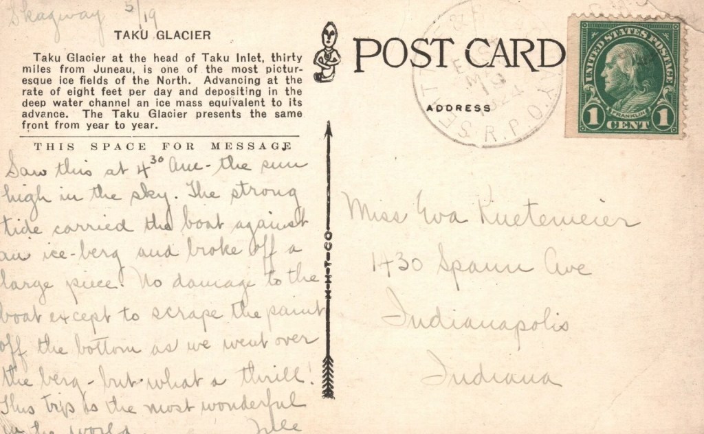 This Taku Glacier postcard was mailed from Seattle, Washington, to Miss Eva Kuetemeier on May 19, 1924. The sender was someone named Nile. I was not able to identify Nile, but did discover that the guy couldn’t write a proper cursive m, turning them into w instead. That had me scratching my head trying to decipher the text.