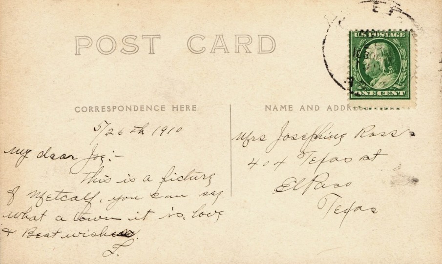I’d never heard of the ghost town of Metcalf, Arizona, until coming across a postcard mailed from there over 115 years ago. Miss Josephine Ross in El Paso, Texas, was the recipient. The mysterious sender simply referred to themself as “L” with a short message as follows:
