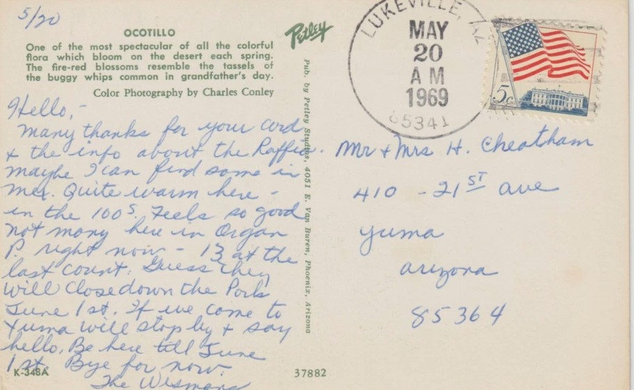 Also on that day, the Wismans sent a picture postcard to Mr. and Mrs. H. Cheatham in Yuma, Arizona. On the front of the card was a photo of an ocotillo cactus. The simple message inside reads:
