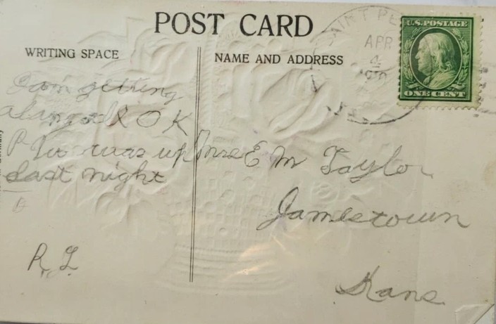 The earliest white settlers to Kansas came by covered wagon, settling in places close to water and having fertile ground to plant their crops. A postcard mailed from St. Peter, Kansas, to Jamestown, Kansas, in 1910, was sent by one of these earliest pioneers. The message this elderly woman wrote in shaky handwriting was very simple: