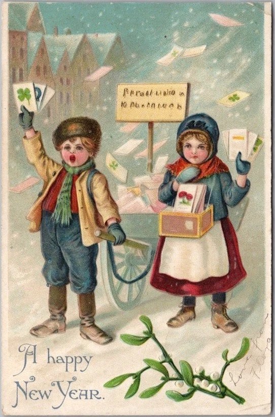 A simple New Year’s postcard sent from someone named Flora to Miss Rose Duff was postmarked on December 30, 1907, and mailed from Cochrane, Wisconsin, to Fountain City, Wisconsin. That is exactly 118 years ago. On the front of the card are two German children selling cards on a cold winter day. Written in pencil is, “Love from Flora.”