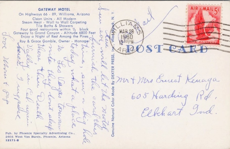 A March 28, 1960, picture postcard I came across shows the Gateway Motel on the front. It only had eight rooms, and this would’ve been the type of place my folks sought out because of price. Motel 6 didn’t exist back then.