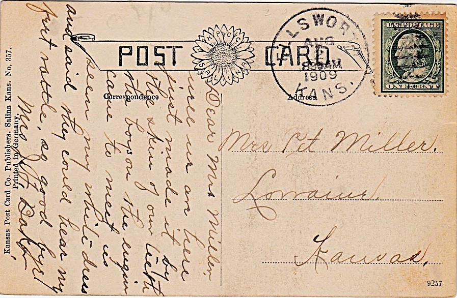 Mrs. J.F. Baker was the wife of Joseph Francis Baker. Her real name was Maria Catherine Kennedy. Married in 1899, the couple moved around the state before finally settling in Nemaha County. They had four children, Clara, John, William, and Paul. Maria was evidently just arriving in Ellsworth when she picked up the postcard.