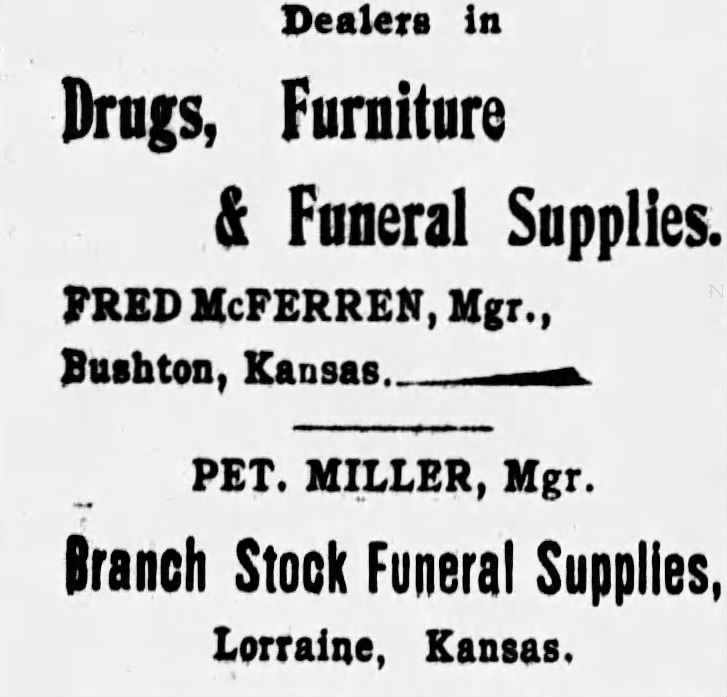 Pete and Ida Miller owned their own business for a short time in Lorraine before selling out and moving to Manhattan, Kansas. At this point, he was a traveling salesman for automobiles and farm equipment. The couple had two boys, Arthur and Edward. Peter died in 1928 at the age of 70, while Ida passed away in 1936. She was 77.