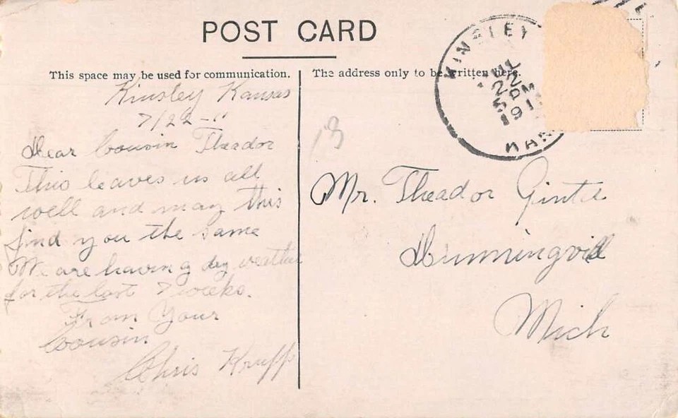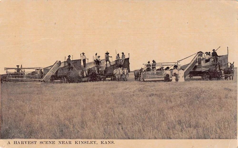 A vintage postcard sent from Kinsley, Kansas, in 1911, to Birmingham, Michigan, contains about as brief a message as I’ve come across. On the front of this card is a photo of men harvesting wheat near Kinsley.