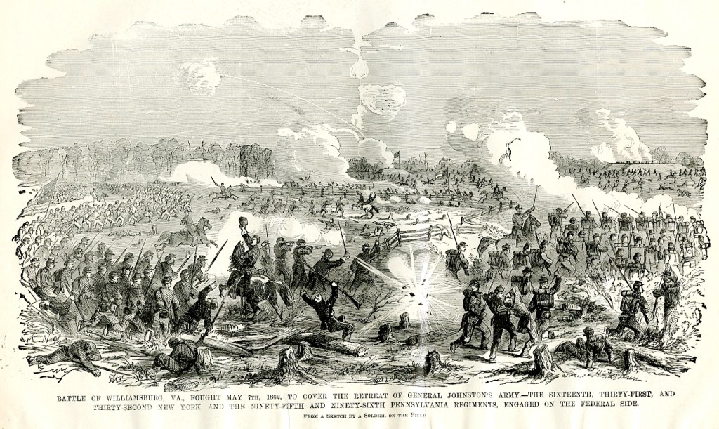 There were 3,965 Union and Confederate soldiers killed during The Battle of Williamsburg. Ironically, a pencil drawing of the battle created by a soldier having fought there, portrays an infantryman being blown backwards when a Confederate shell explodes in front of him. It appears the man’s carrying a Springfield Model 1861.