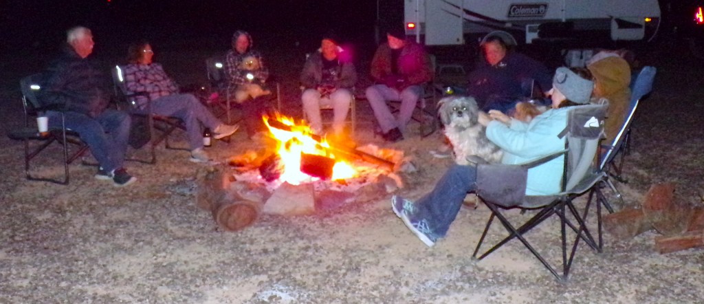 Getting back to my camping experience—there were at least 40 of us in 30 different model RVs, along with 19 dogs, 3 cats, and 2 Amazon parrots. United States flags were flown on tall telescoping poles attached to the rigs. Some of the poles had red, white, and blue LED lights on top—visible for miles away. It was a sight to behold!
