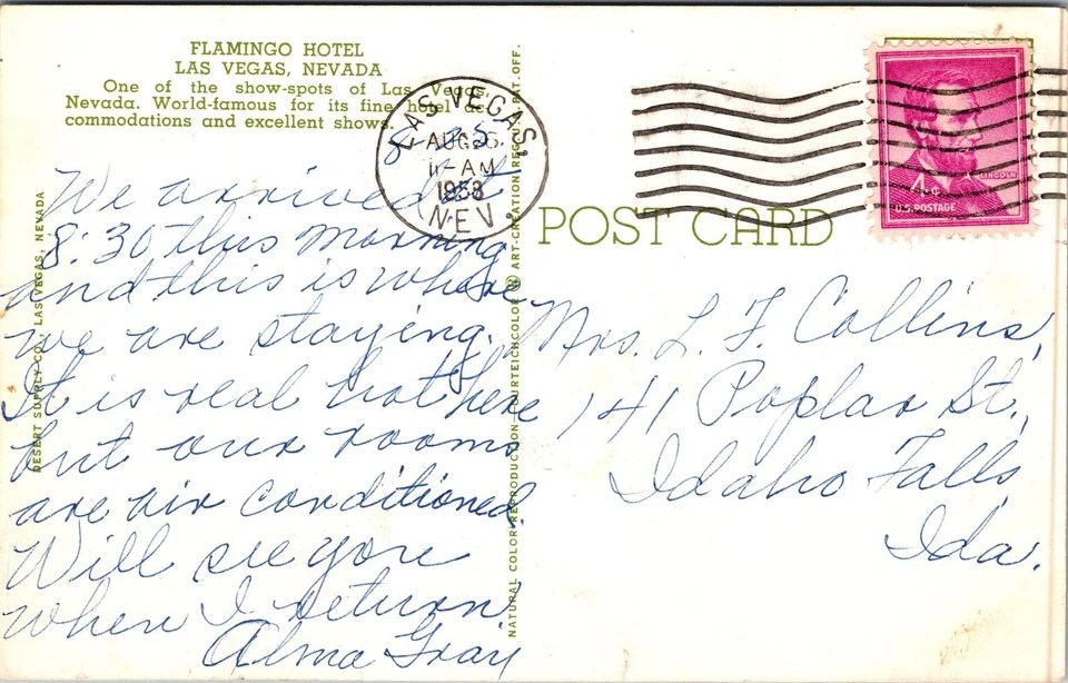 I can only speculate here. Friends and family undoubtedly told Alma after Charles died that she needed to get out of the house more often, “Take a trip!” they said. Finding a good deal on a bus excursion from Idaho Falls to Las Vegas, she did just that. Alma’s postcard to Mrs. L.F. Collins described what she found once she got there.
